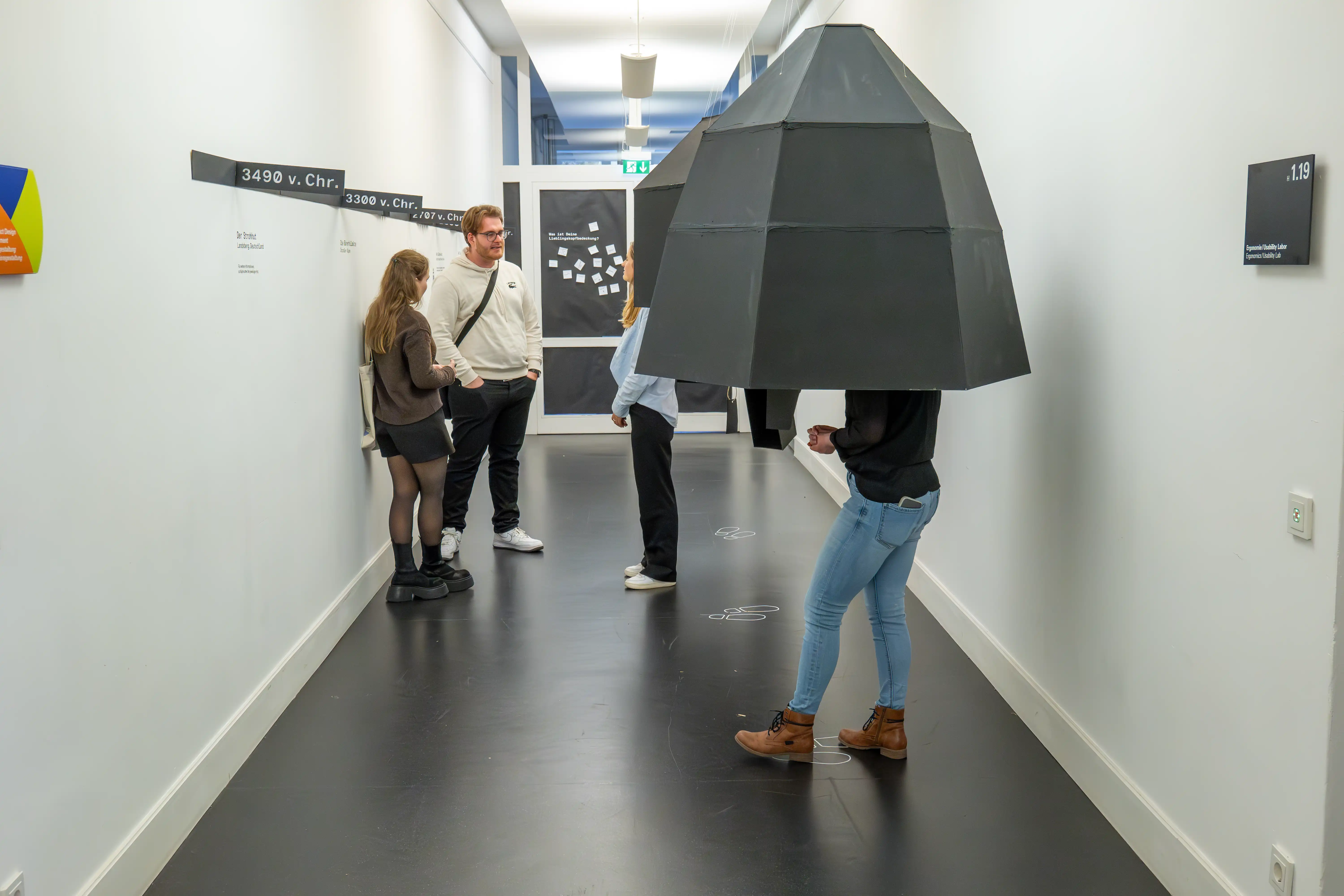 Im IKS-Kurs haben wir uns mit den frühesten Hüten der Geschichte beschäftigt. Dafür erstellten wir eine Zeitleiste mit übergroßen Exponaten, unter die Besucher treten konnten.