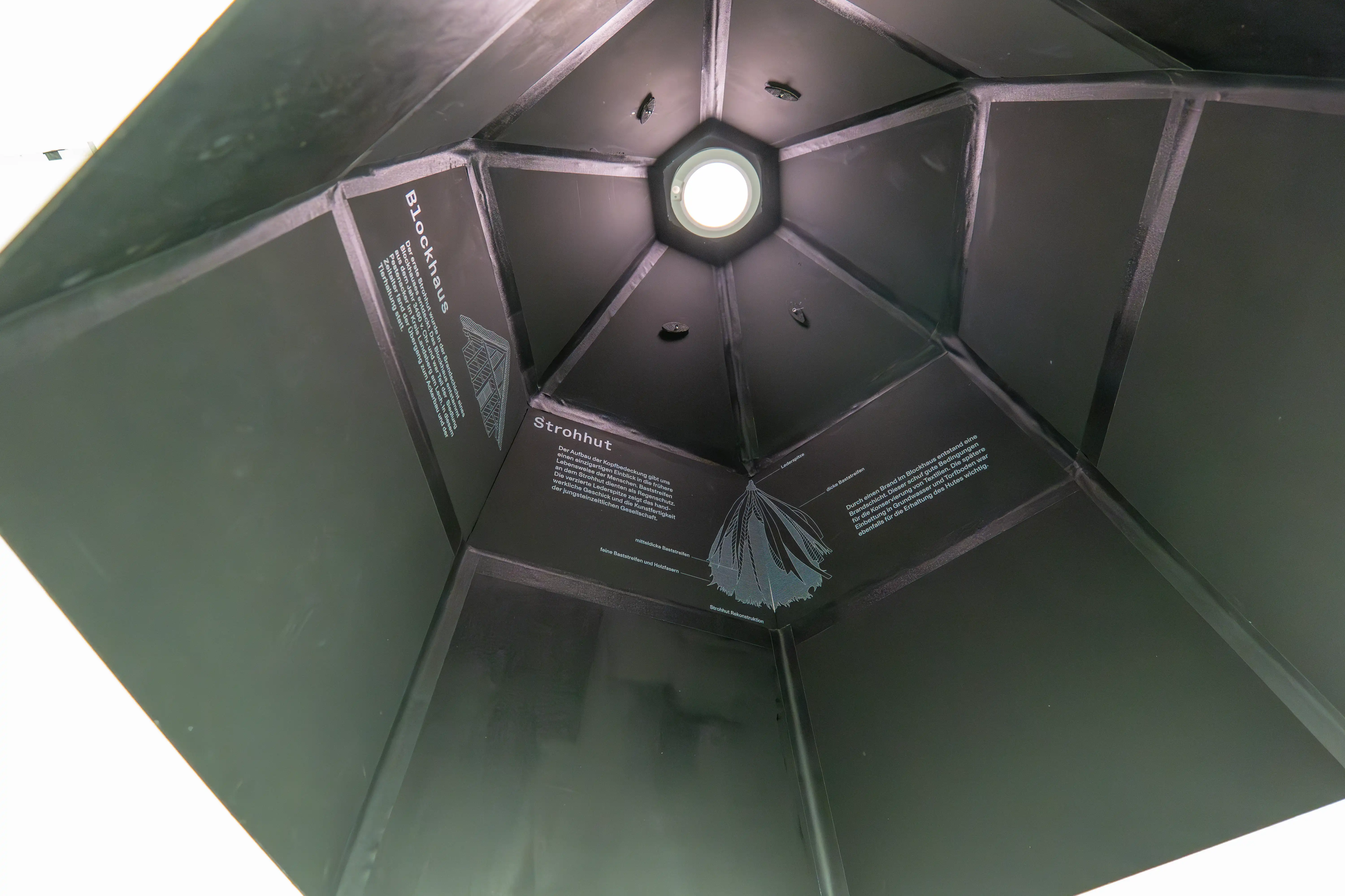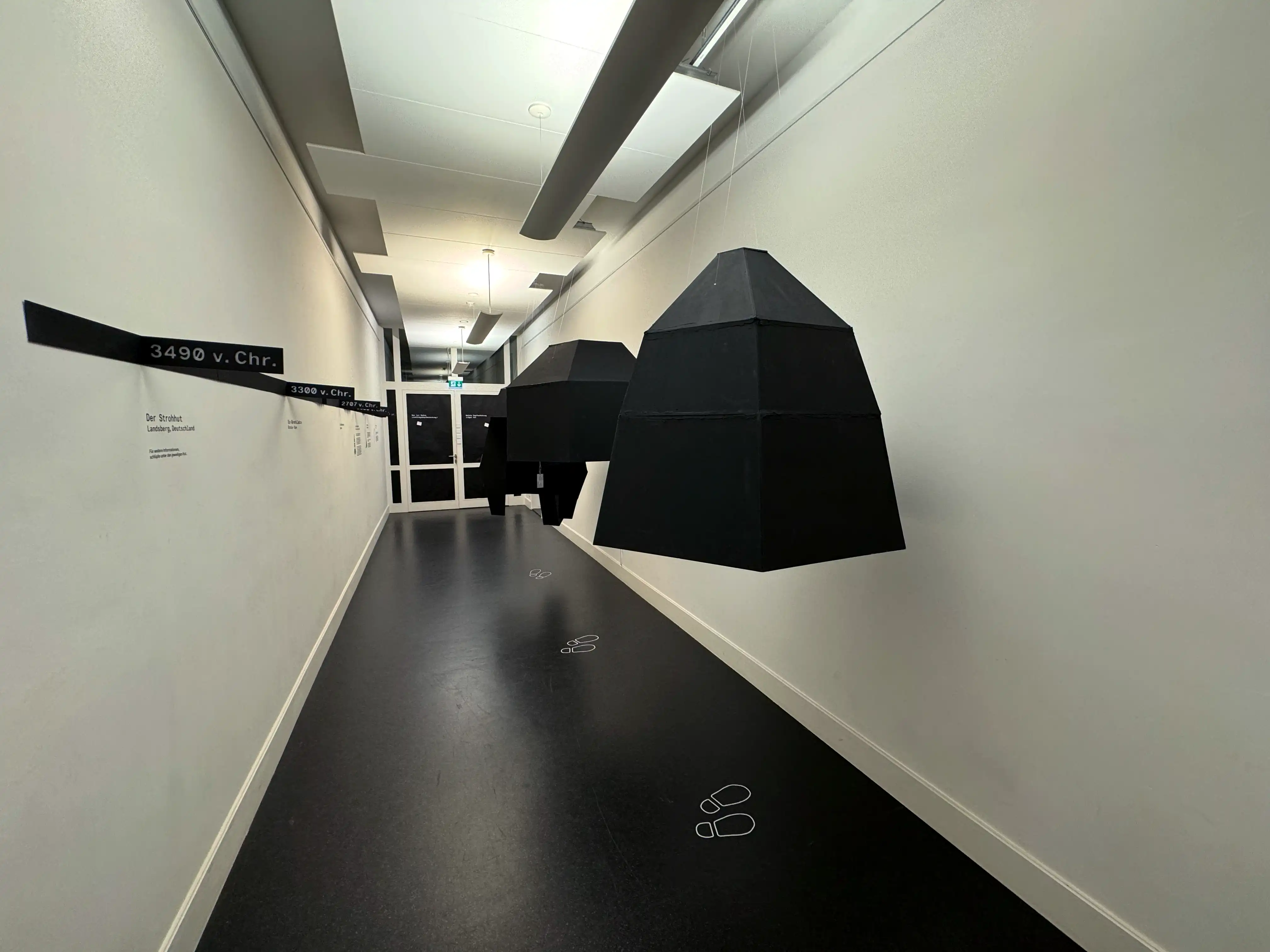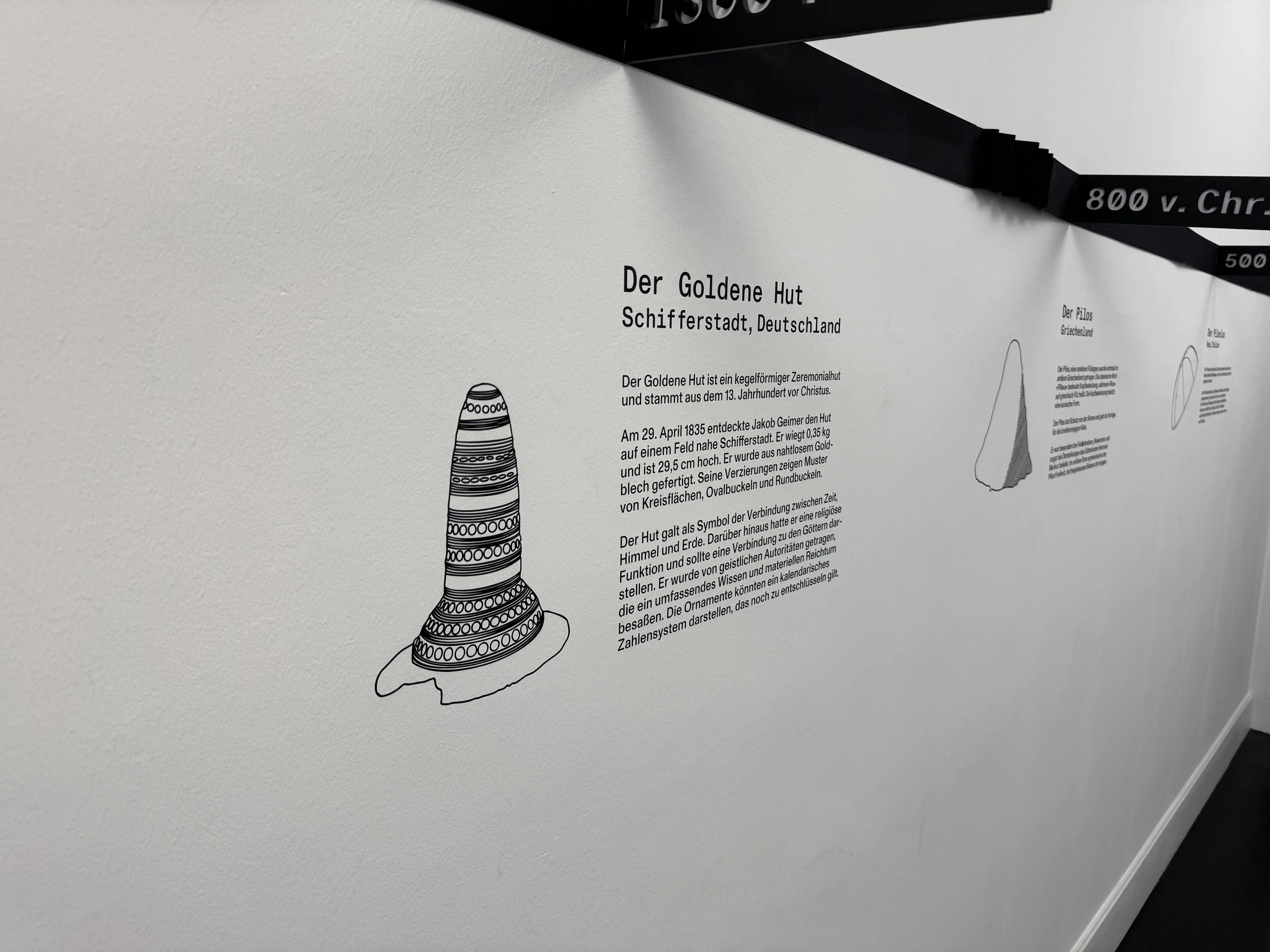 Die drei Modelle repräsentieren die drei ältesten bekannten Hüte, während weitere interessante Funde entlang der Zeitleiste aufgeführt sind. Um die Abstände zwischen den Hüten zu standardisieren, wurden Faltungen in die Zeitleiste integriert, die eine Verdichtung symbolisieren.